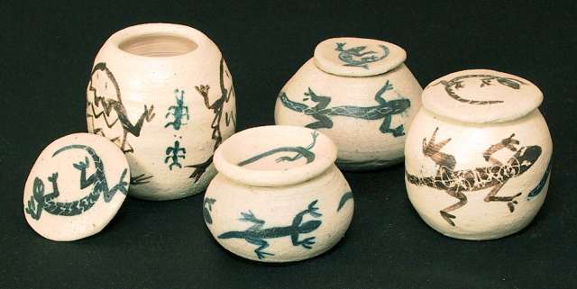 | Tiny lidded lizard, horn toad or snake jars, hand thrown,